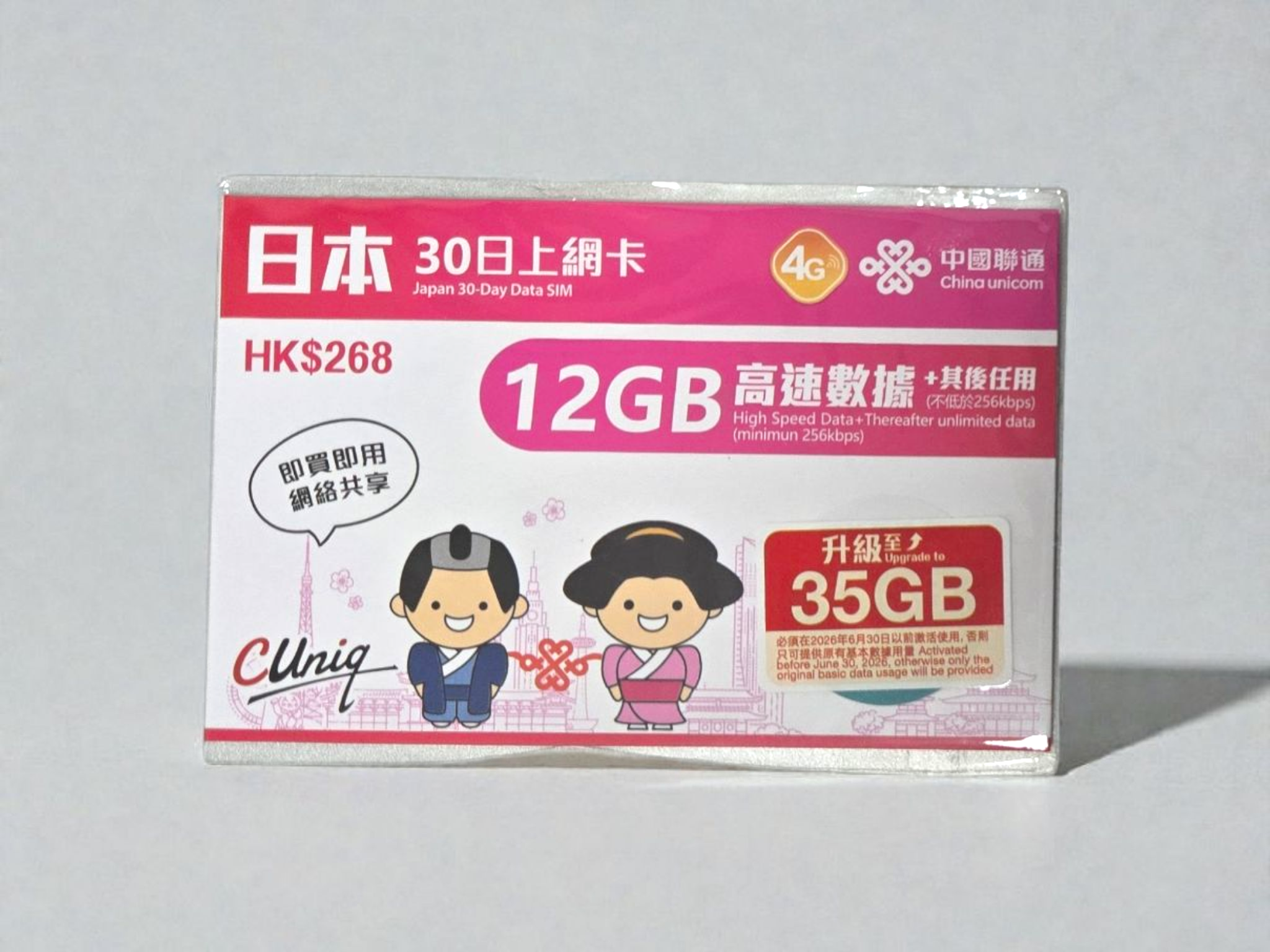 中國聯通 日本4G 30日上網卡 (限時升級至 35GB 後降速)